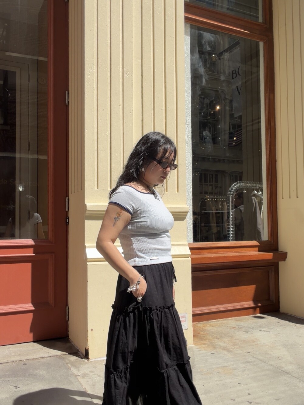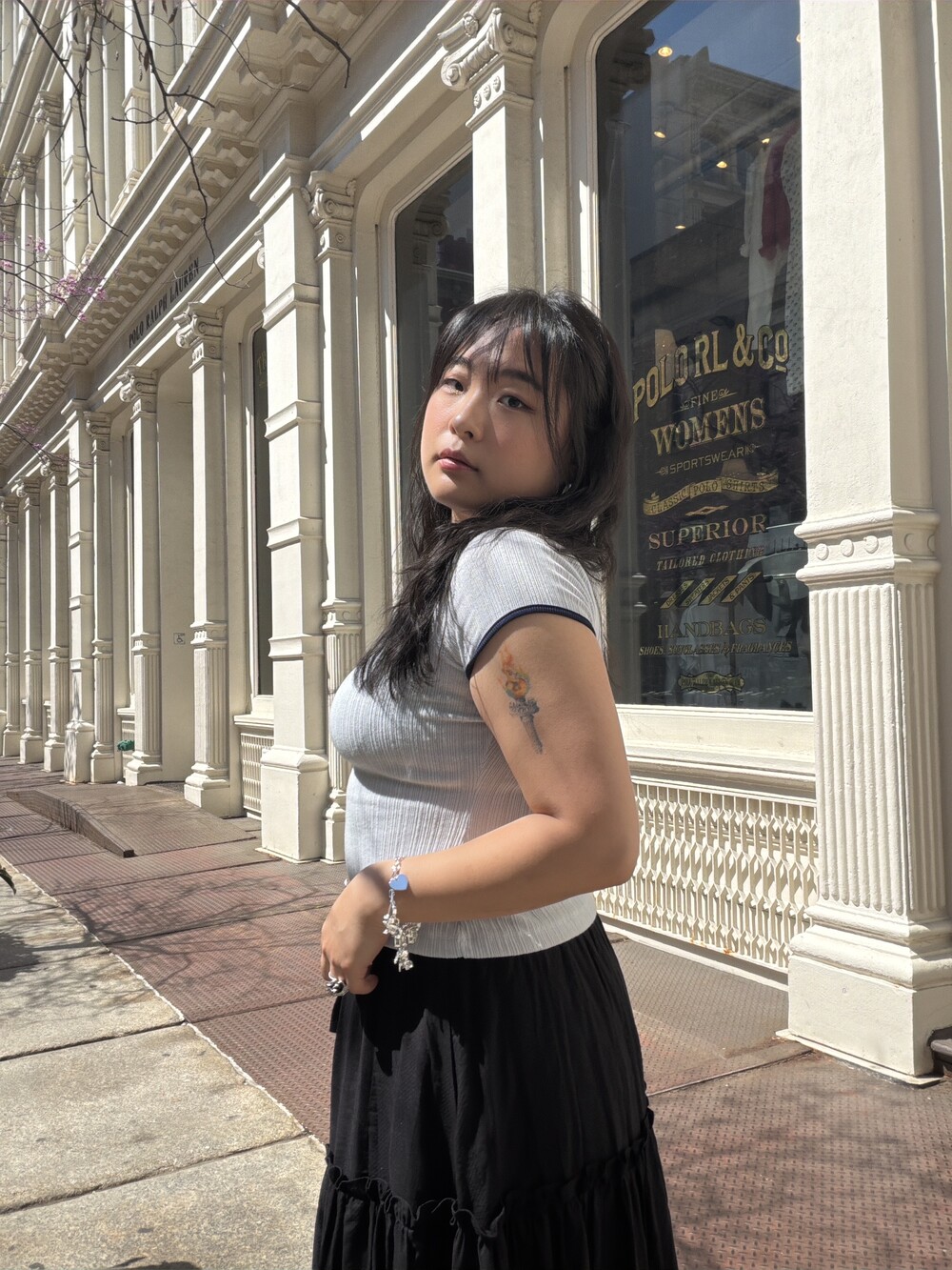 * Lightweight, stretchy ribbed fabric (Body - 95% Poly, 5% Span, Binding - 96% Rayon, 4% Span)
