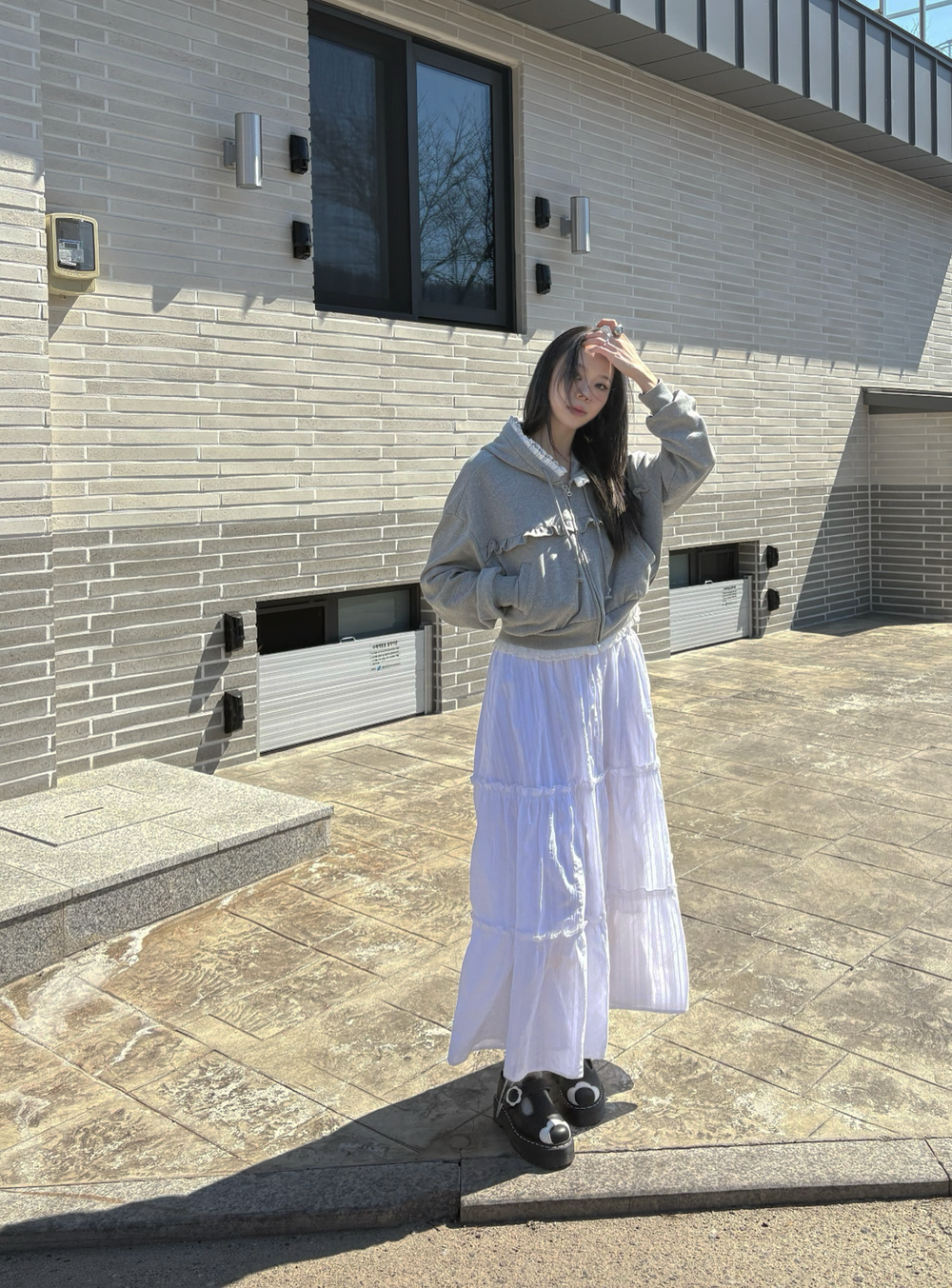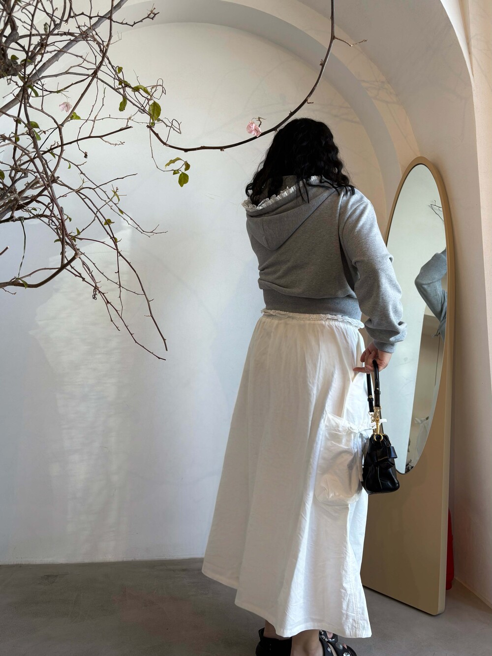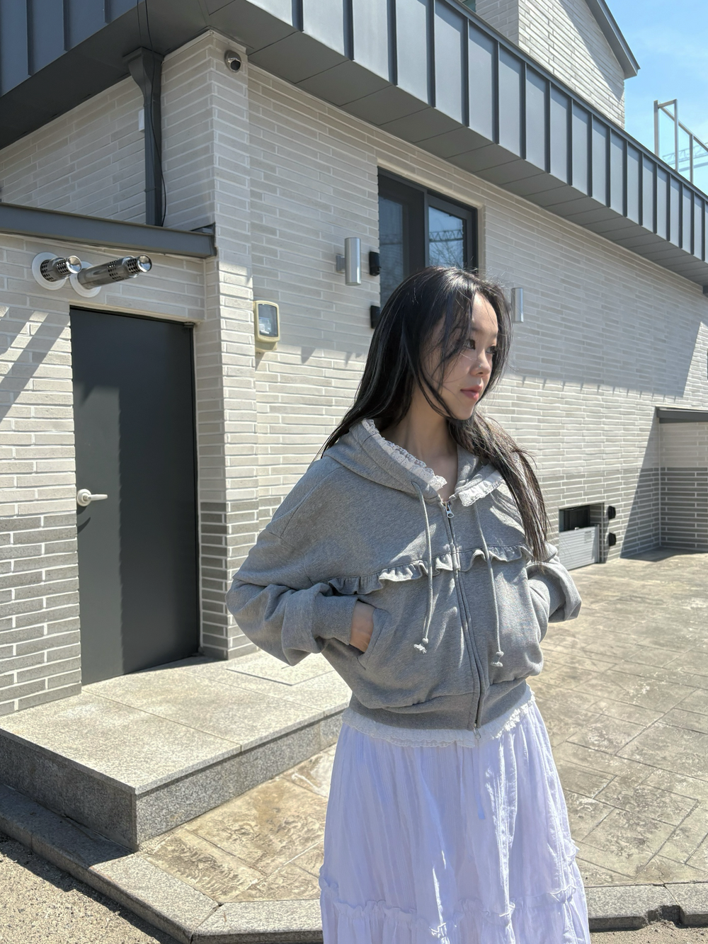 * Lace ruffle details on the hem and hoodie for a romantic touch