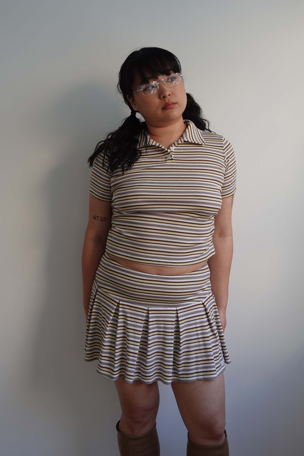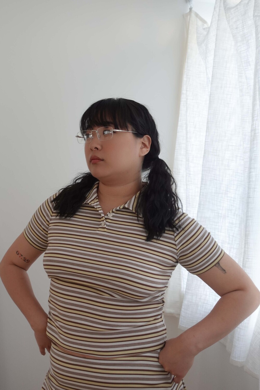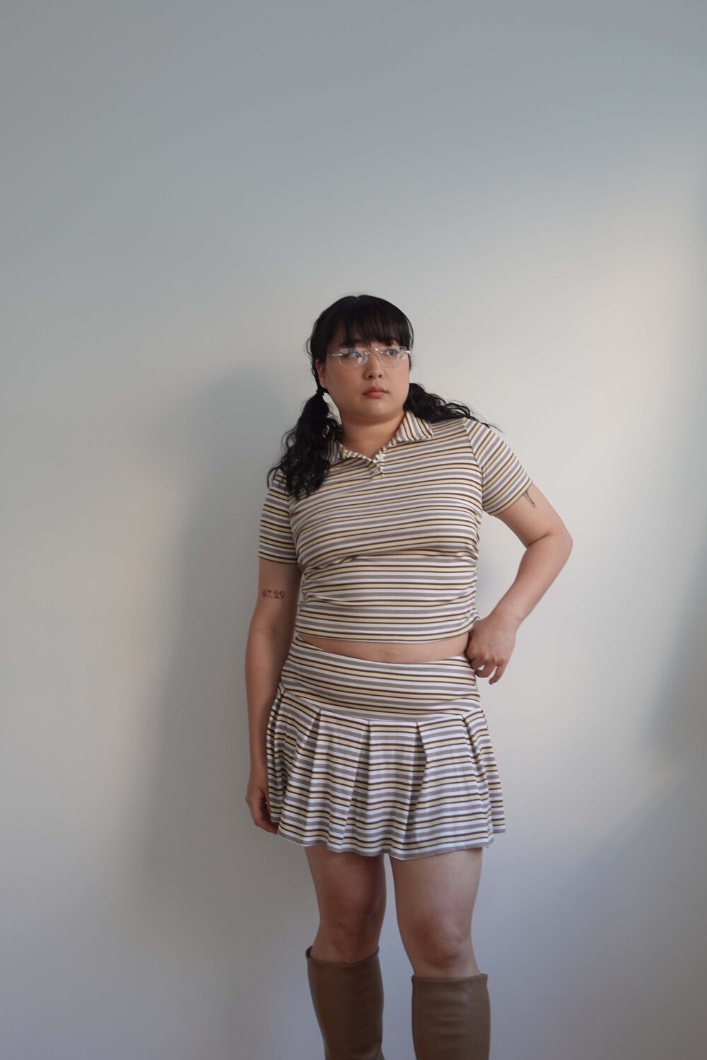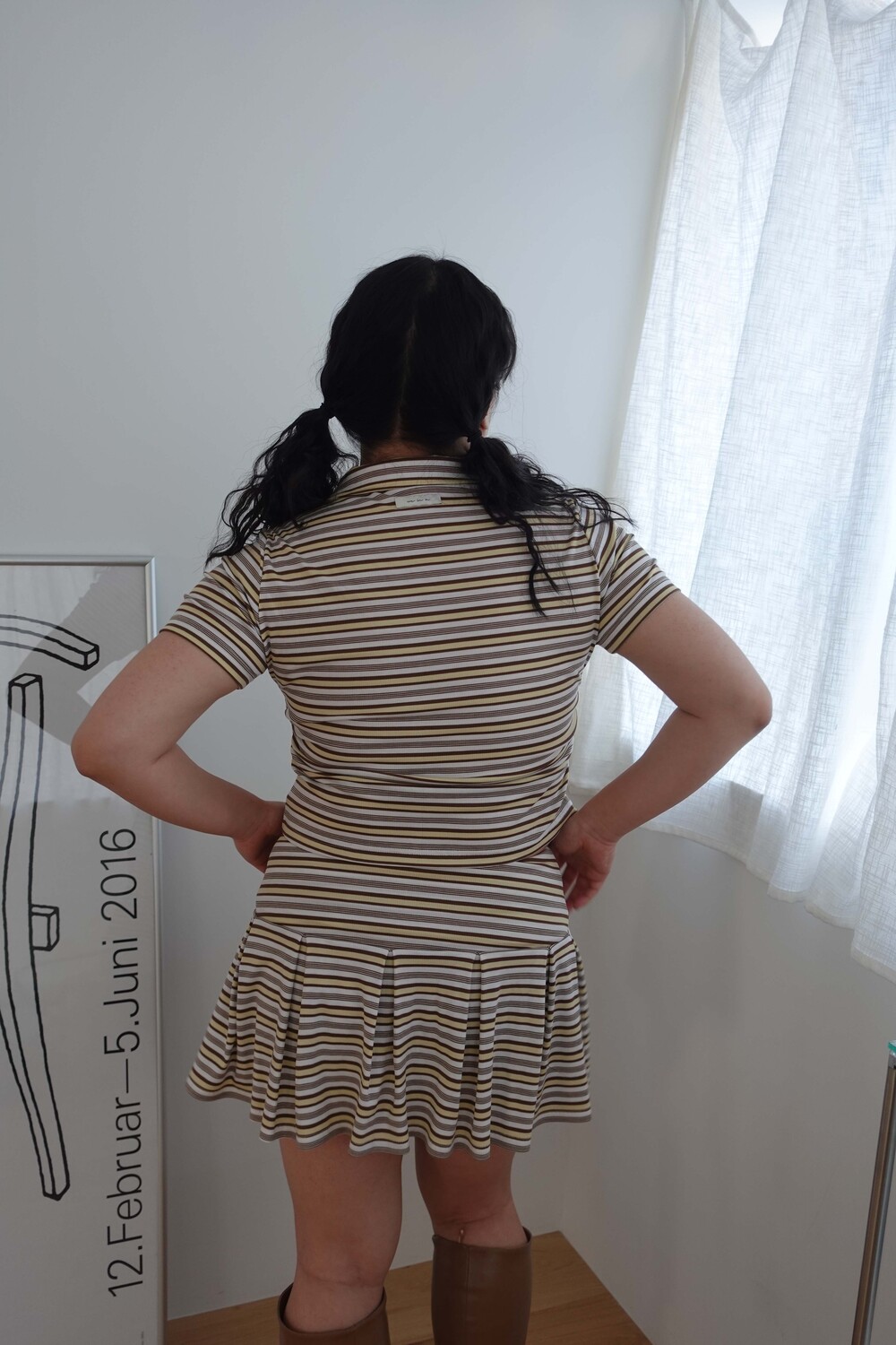 * High-stretch striped fabric in brown, yellow, and white (91% Rayon, 9% Polyester)