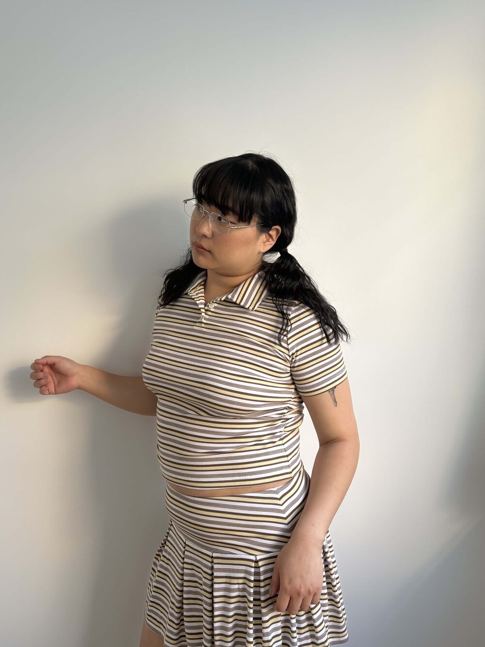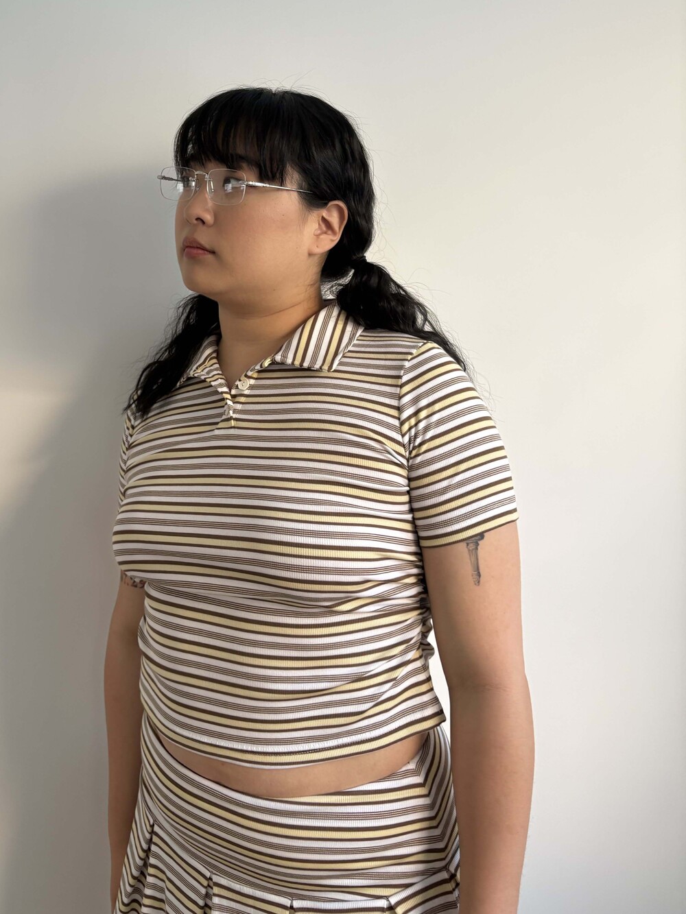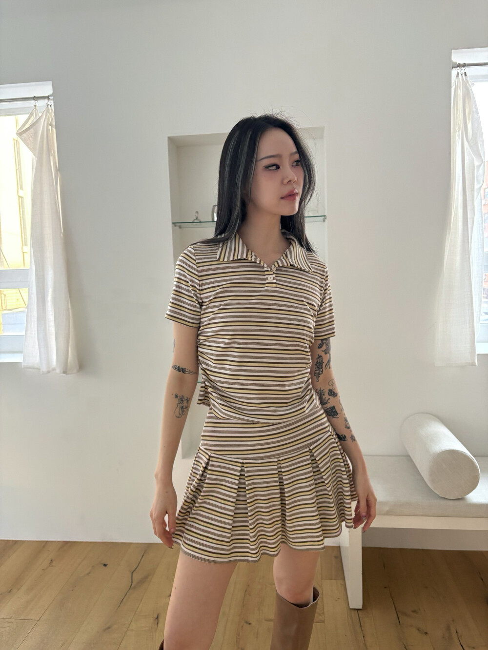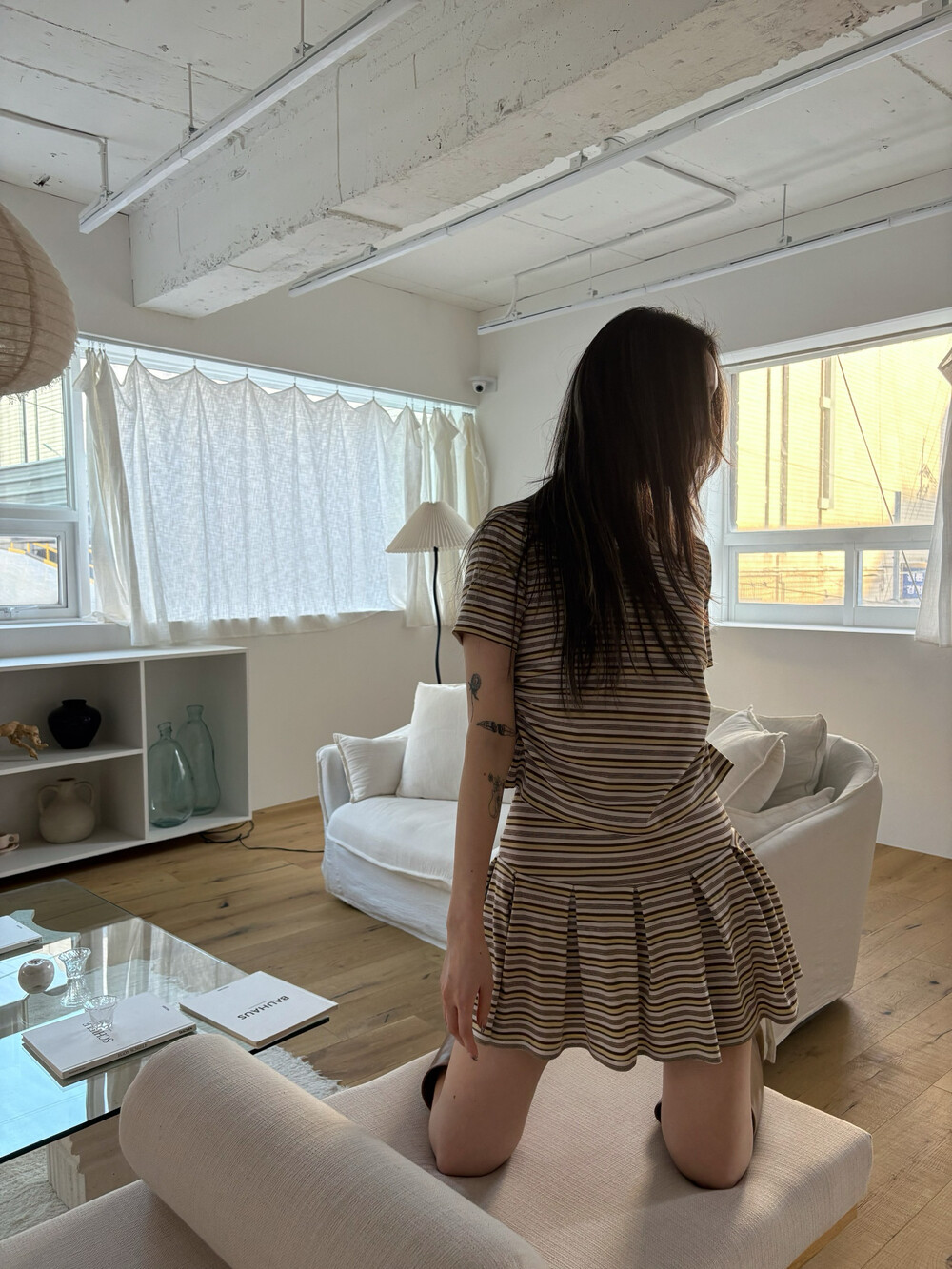 * High-stretch striped fabric in brown, yellow, and white (91% Rayon, 9% Polyester)