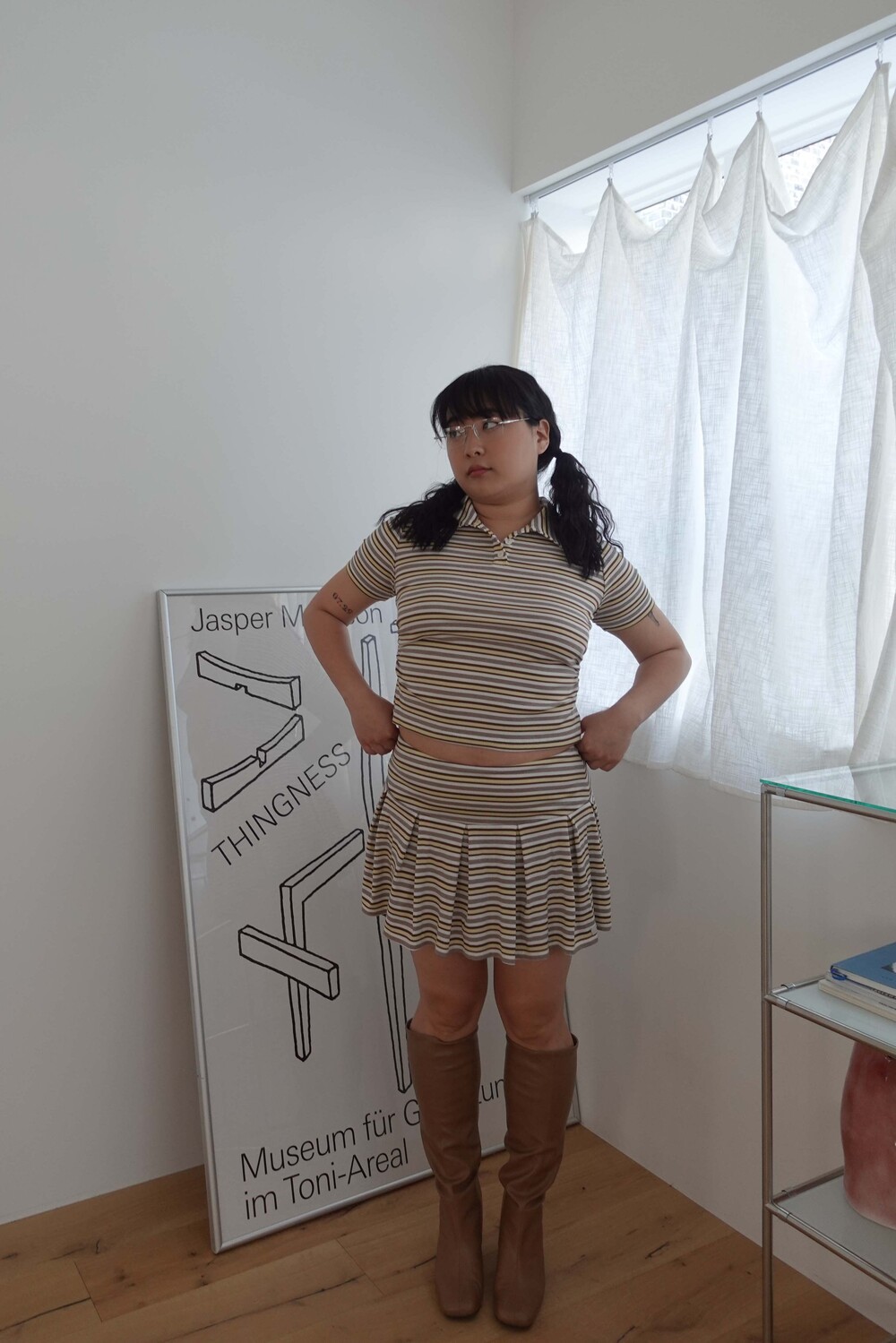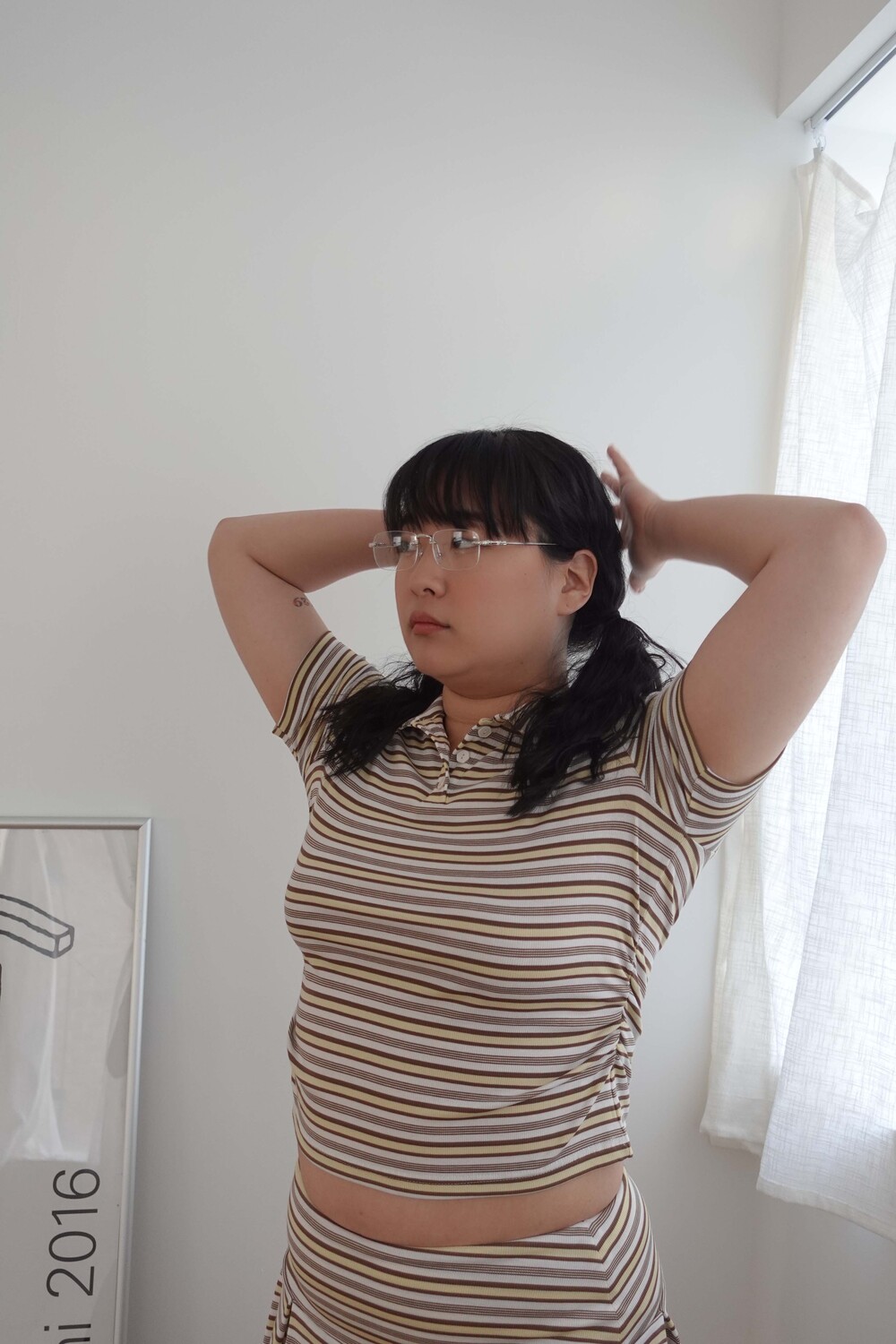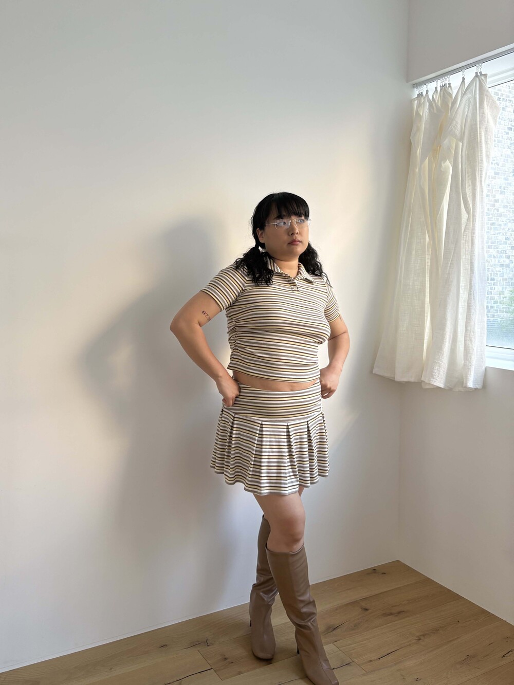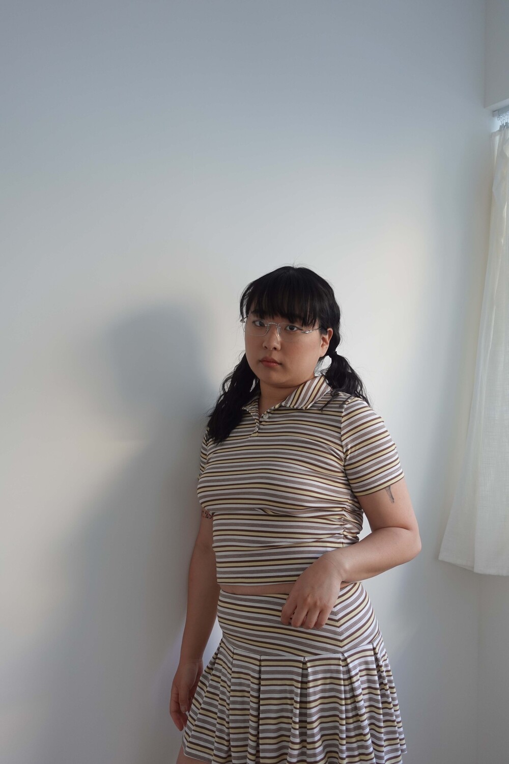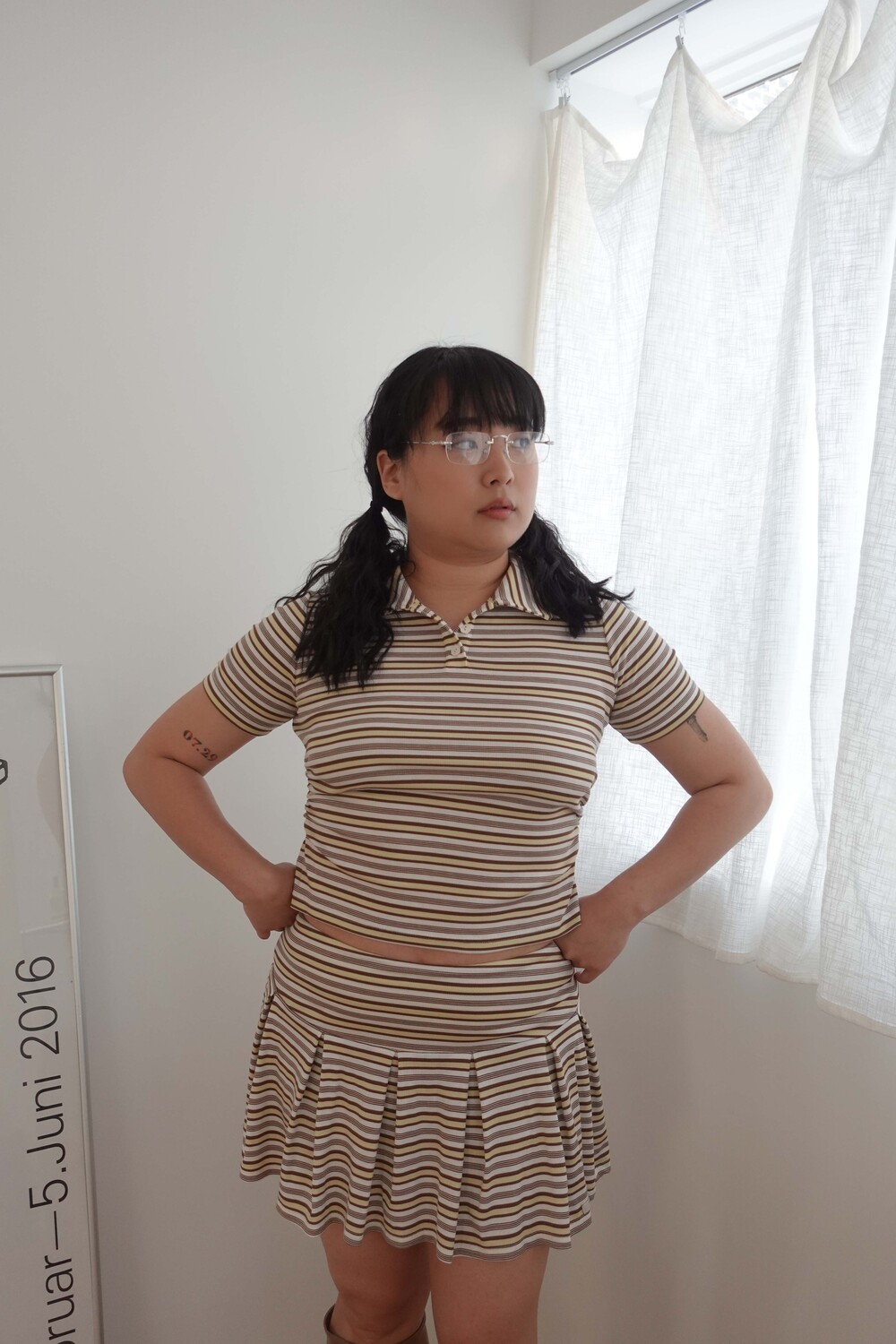 * High-stretch striped fabric in brown, yellow, and white (91% Rayon, 9% Polyester)