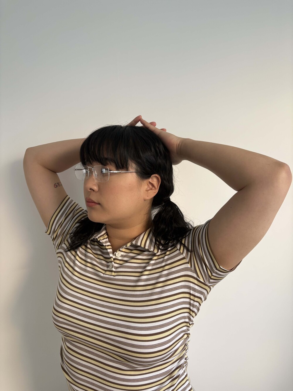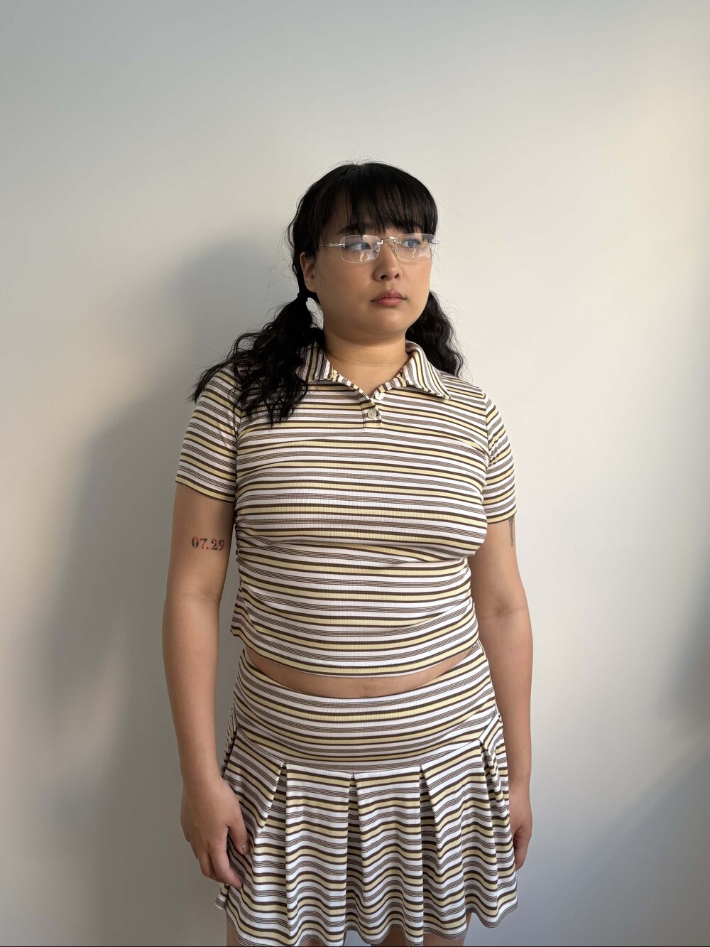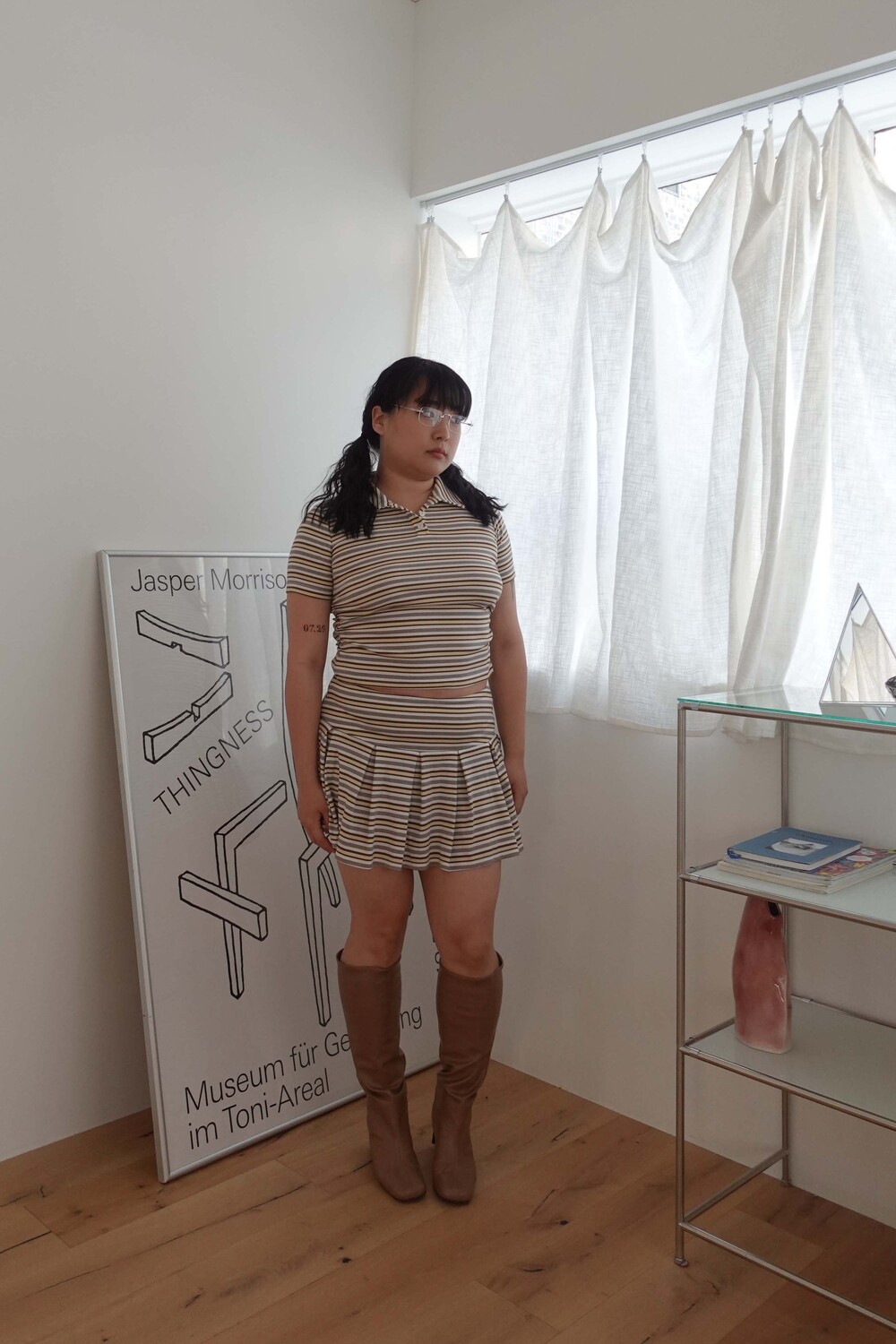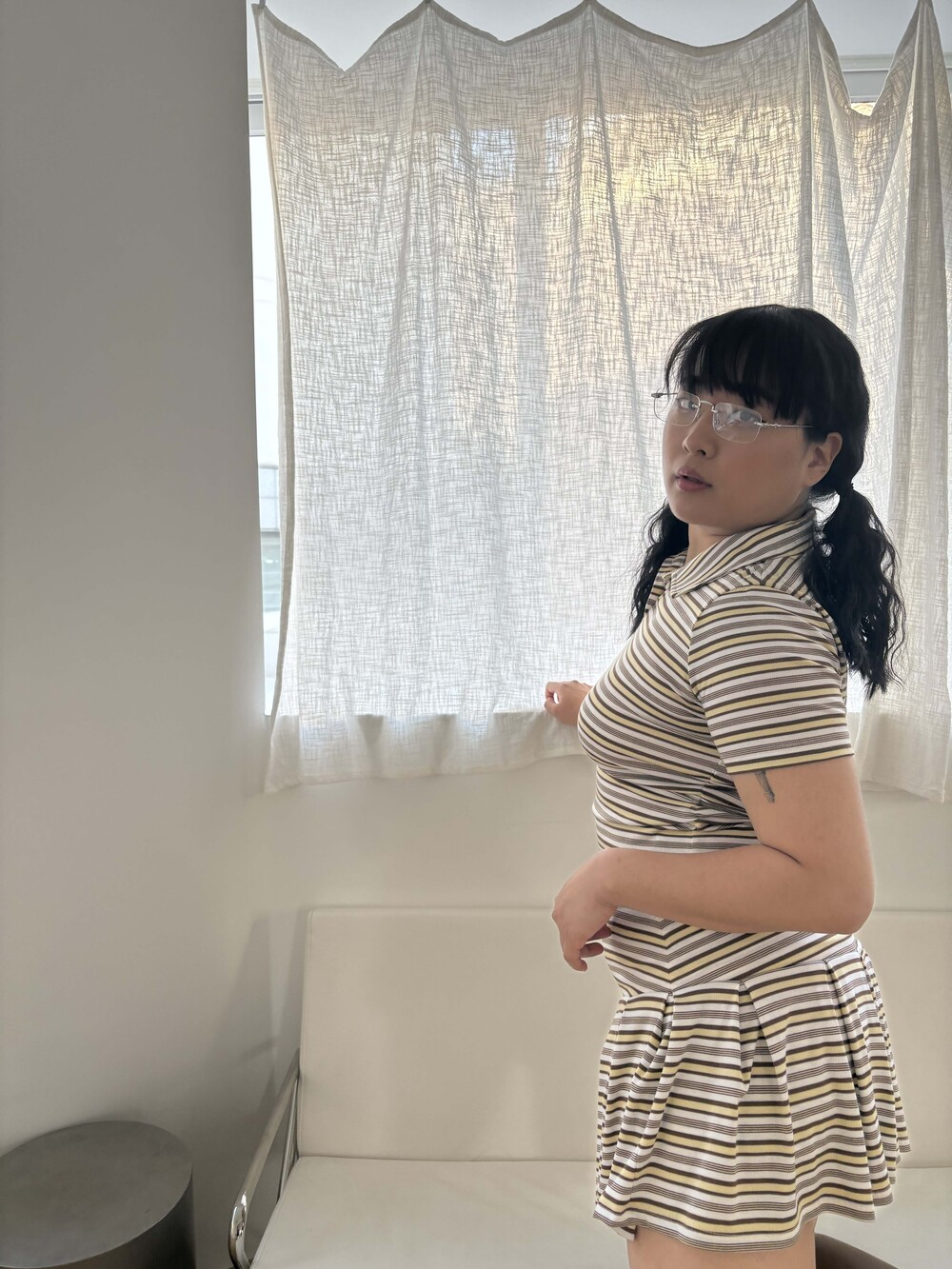 * High-stretch striped fabric in brown, yellow, and white (91% Rayon, 9% Polyester)
