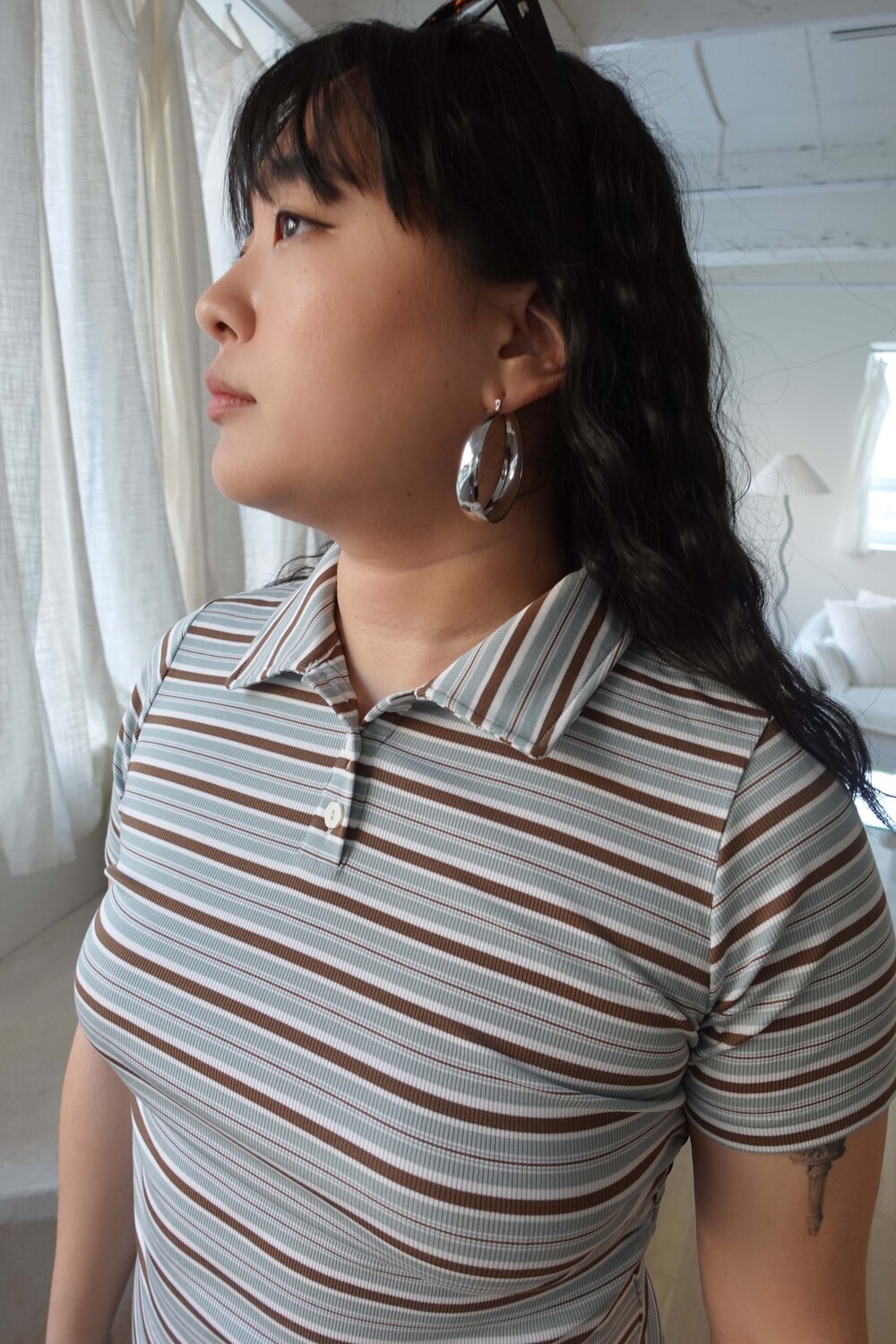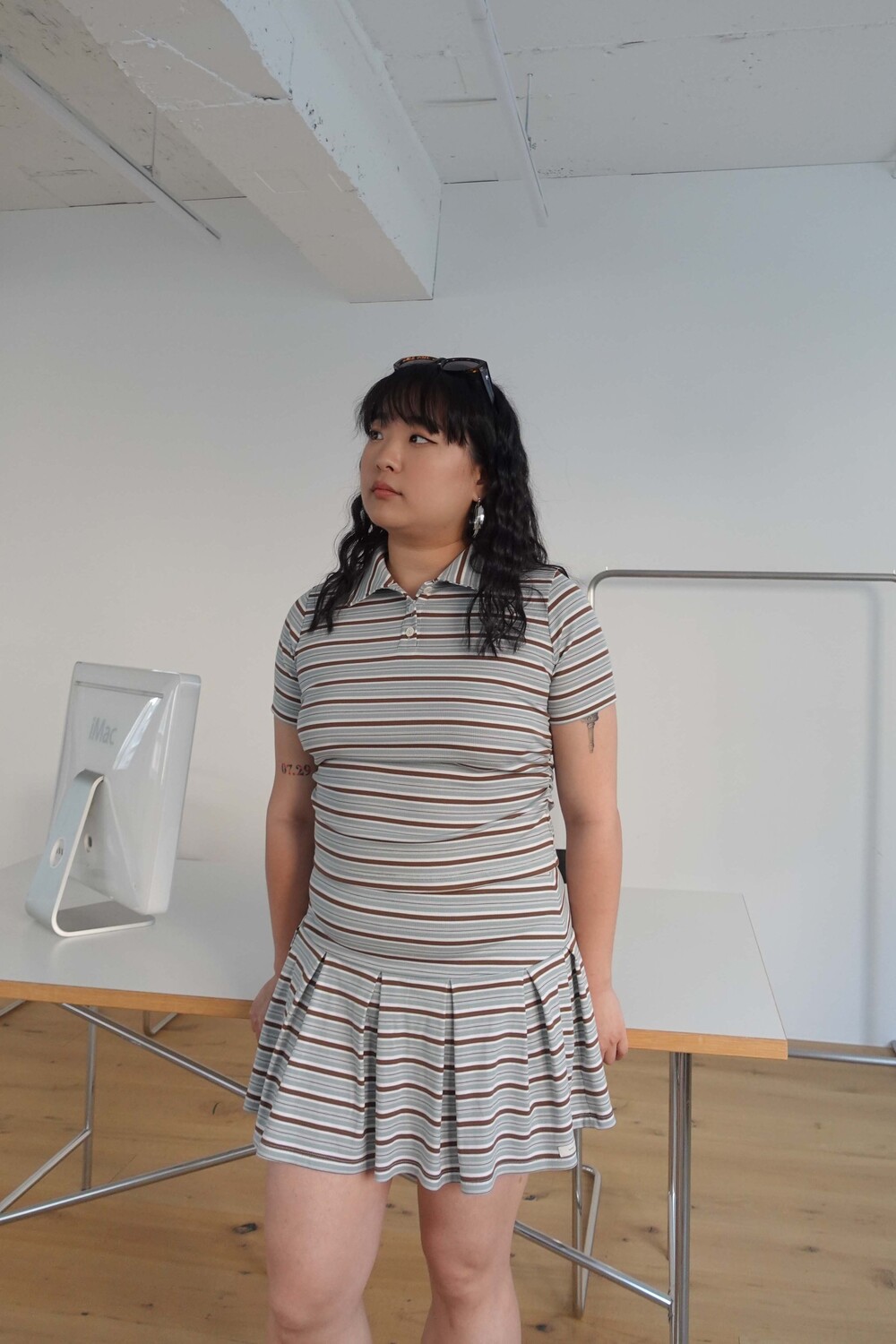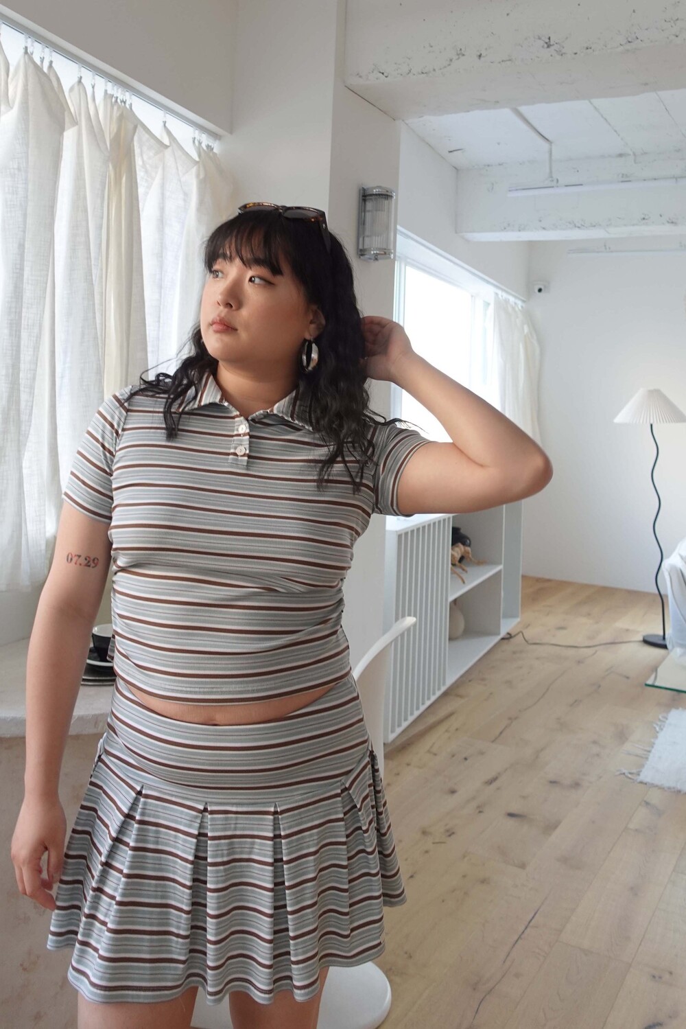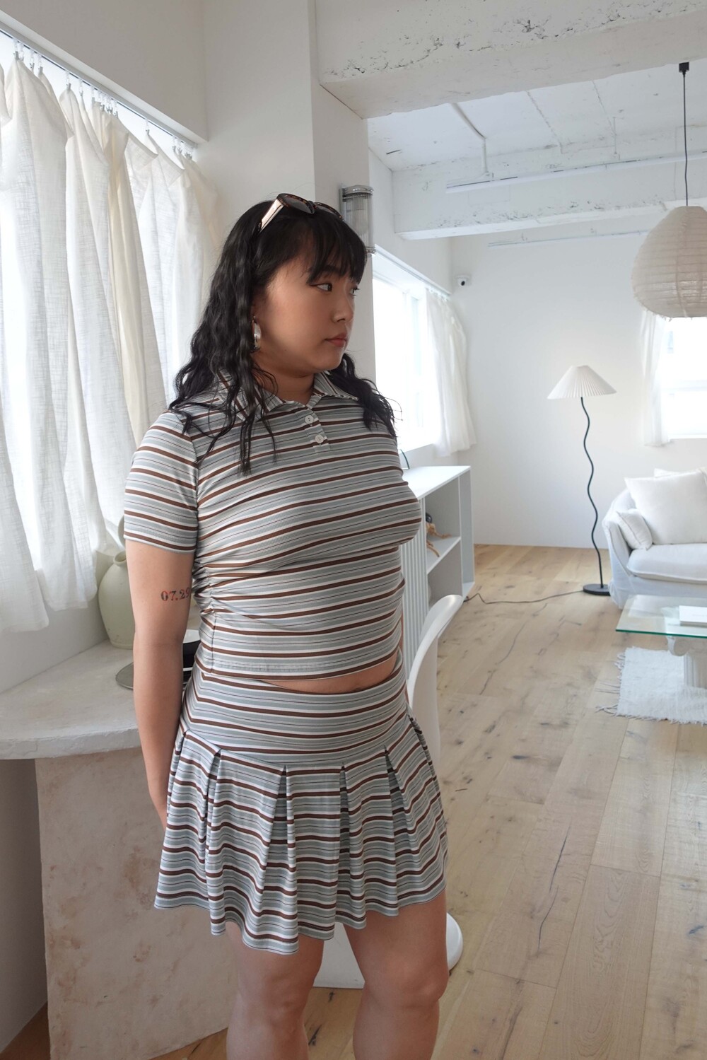 * High-stretch striped fabric in mint, brown, and white (91% Rayon, 9% Polyester)