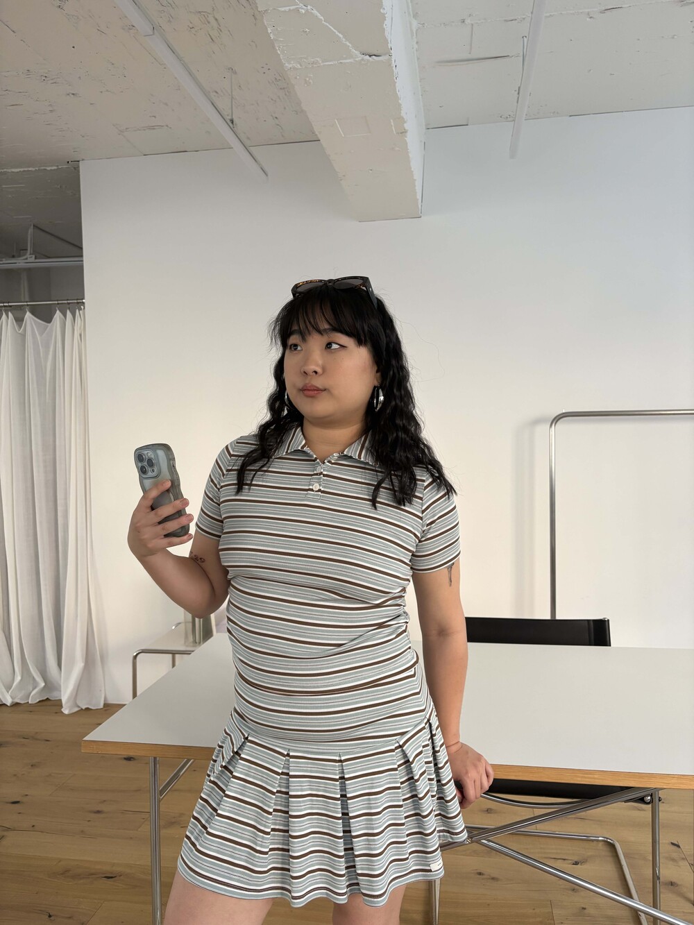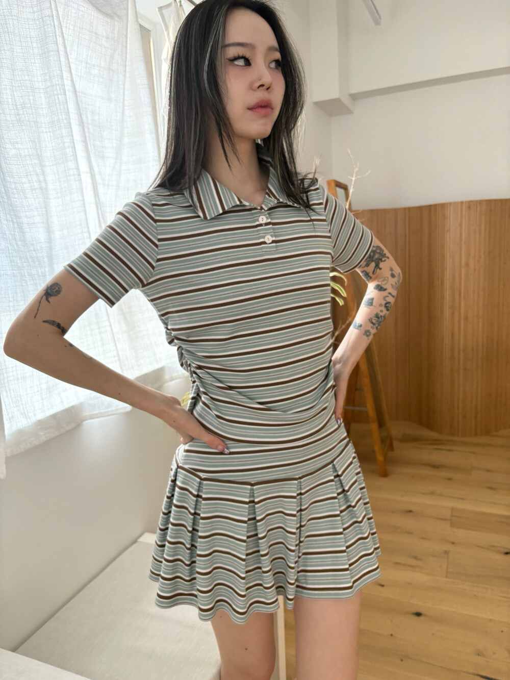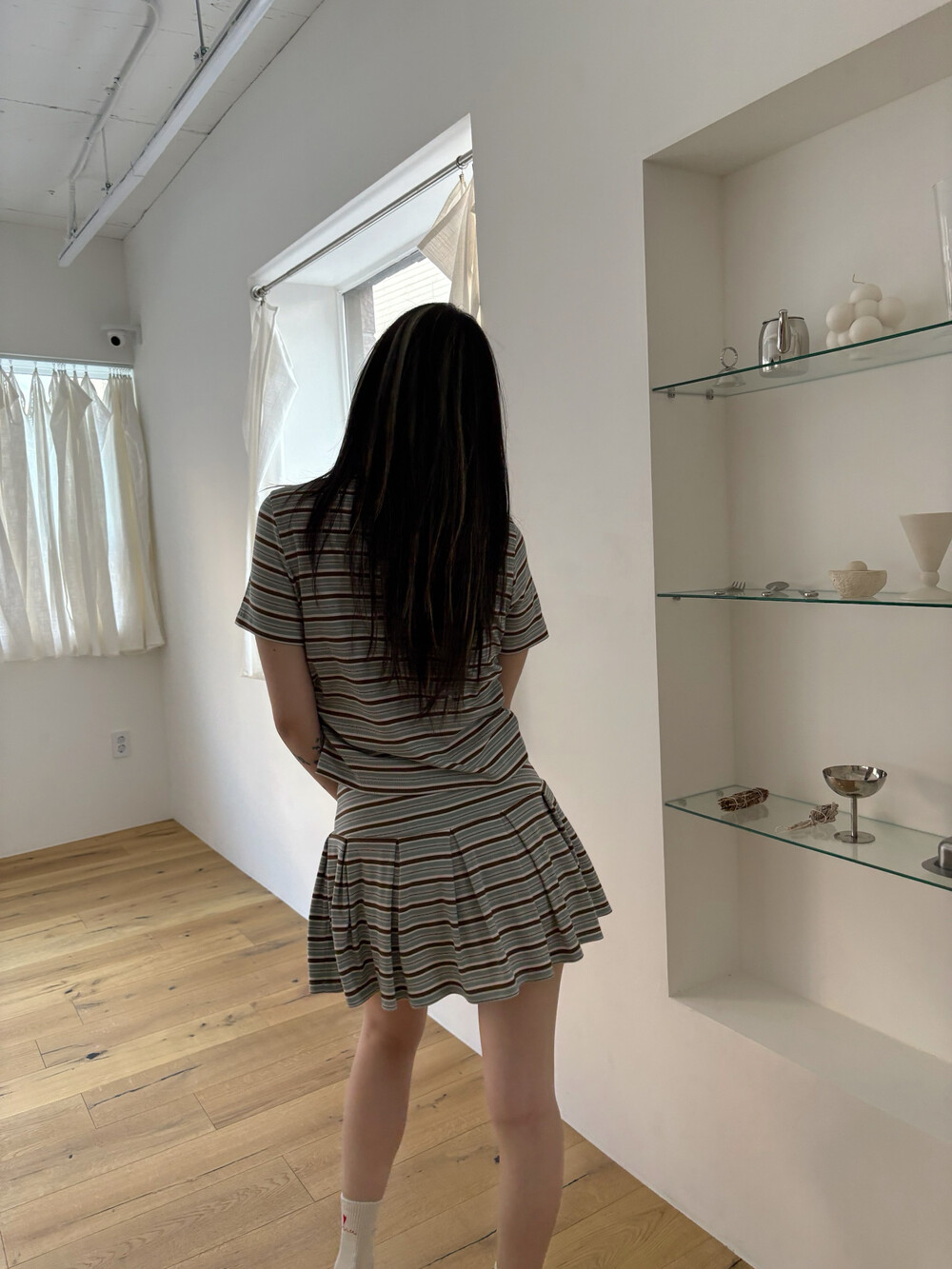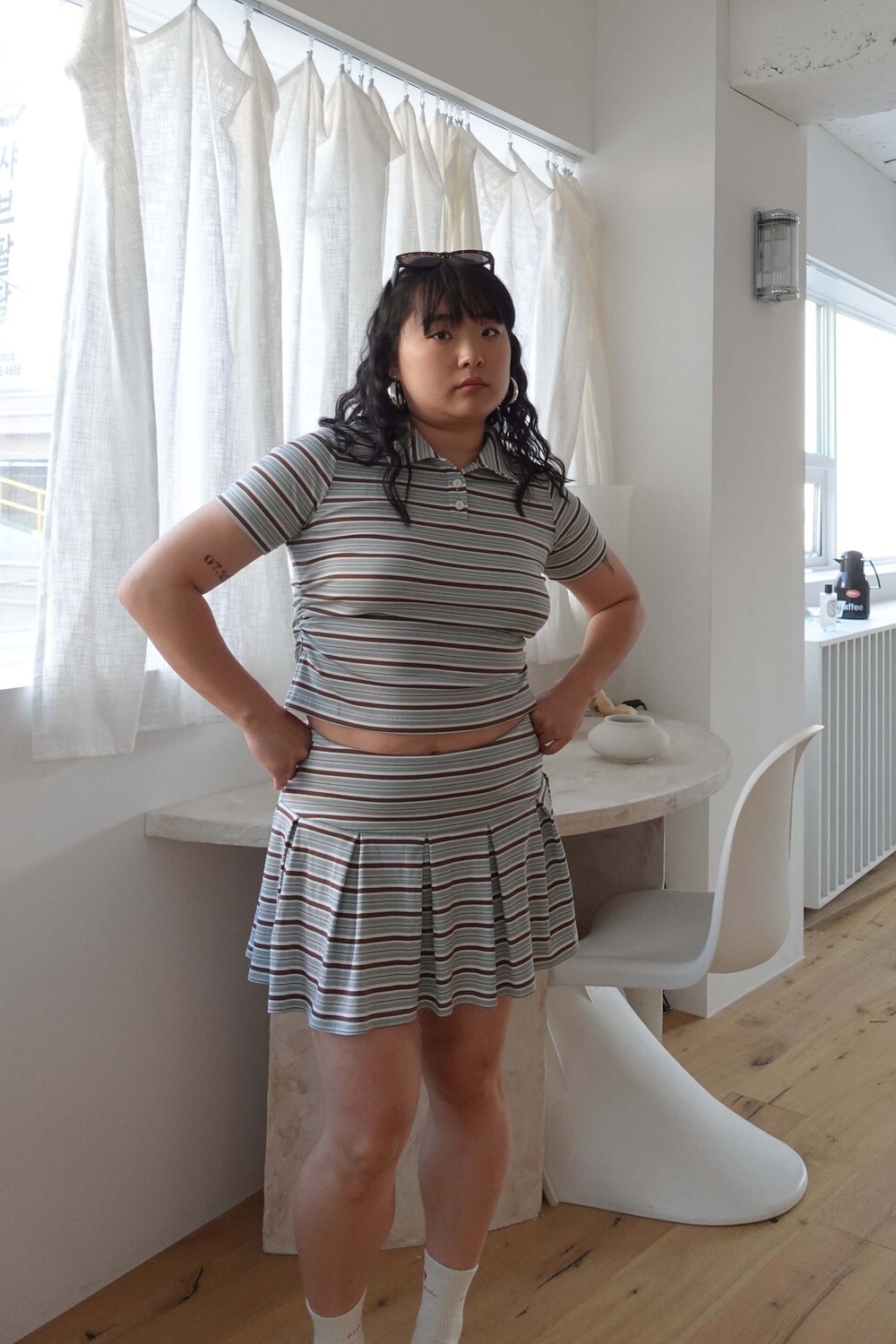 * High-stretch striped fabric in mint, brown, and white (91% Rayon, 9% Polyester)